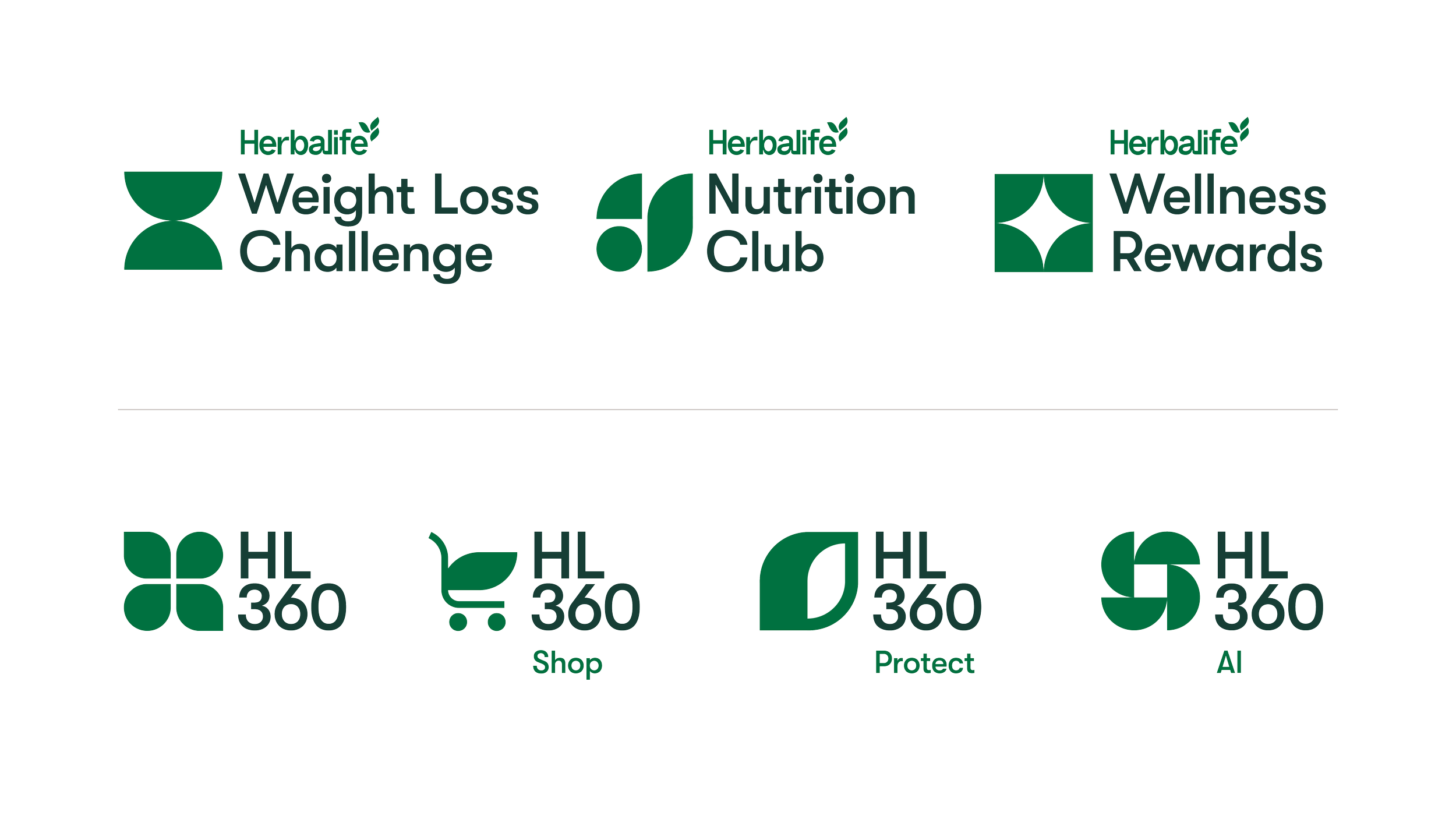 Lockups use a geometric typeface that complements the icon style, with consistent typography across consumer programs and HL360 to keep the system unified. Forest green adds a more premium feel, while garden green reinforces consistency across the broader brand.
